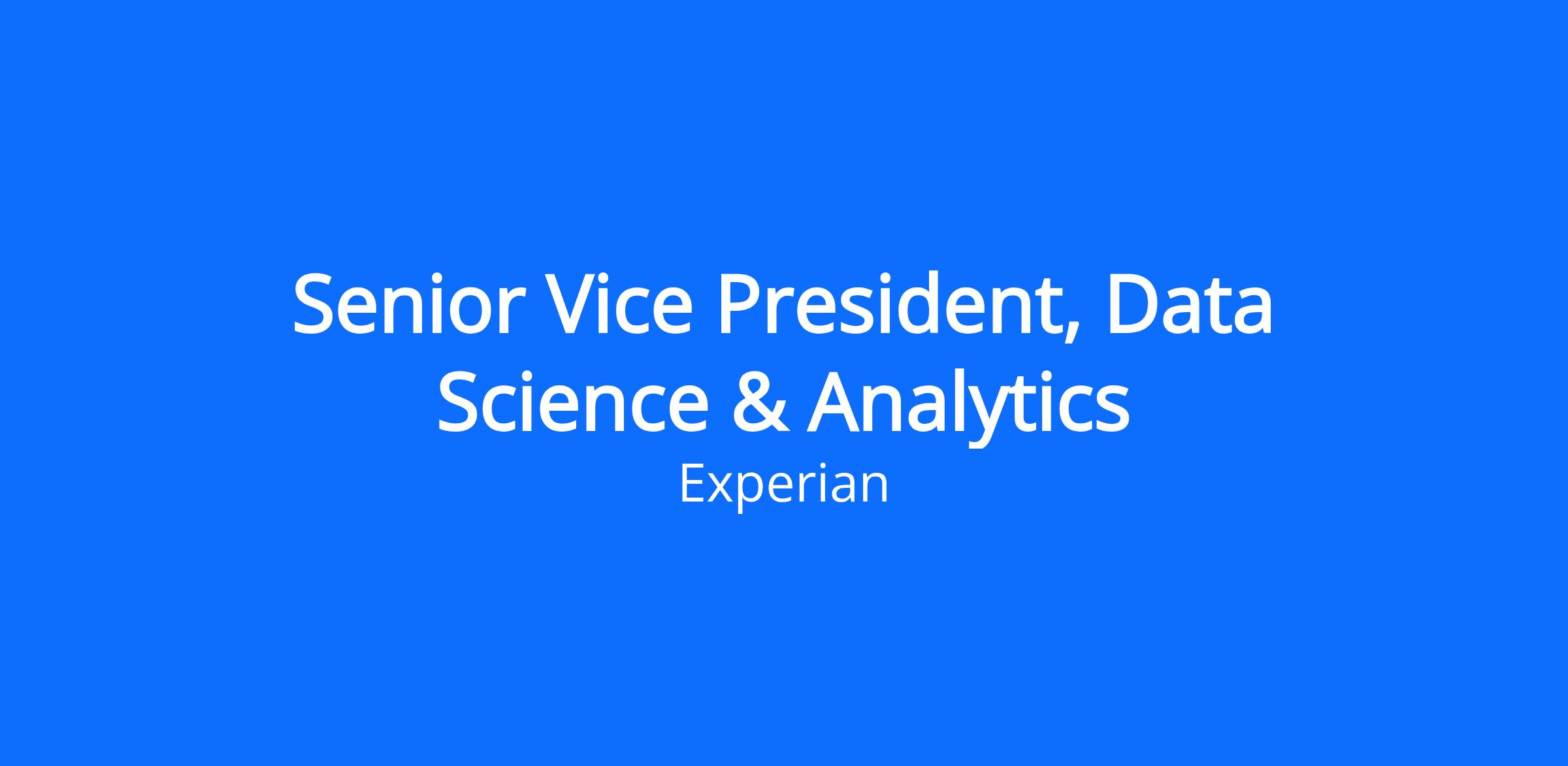 The Senior Vice President, Data Science & Analytics (North America) will have holistic responsibility for all data science and analytics functions of the Financial Services & Data business. The role reports directly to the Chief Product and Analytics Officer of Financial Services & Data, and is the catalyst for transformation within the business, helping to evolve the way Experian provides insights to support existing customers and drive innovation.